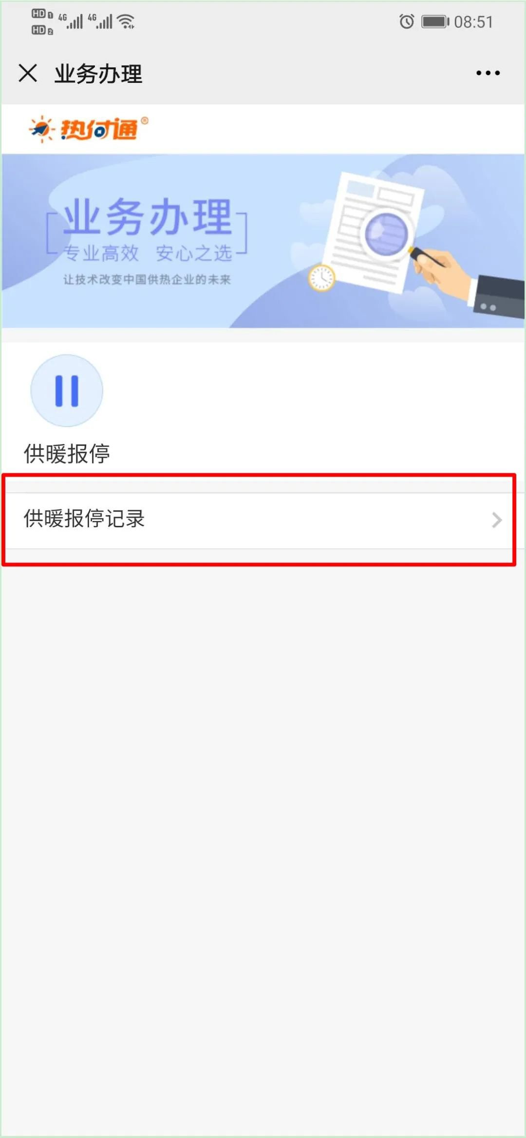 7.若想查询房屋是否办停,可在“业务办理”界面点击“供暖报停记录”。