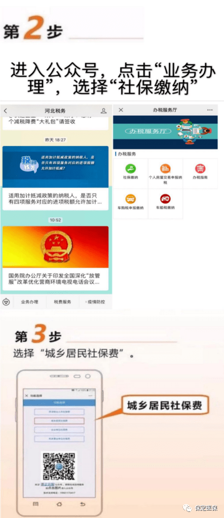 (1)微信缴费。缴费人关注“河北税务”微信公众号,点击:办税服务厅--社保缴纳--城乡居民社保费,输入身份证号码后,进行缴费