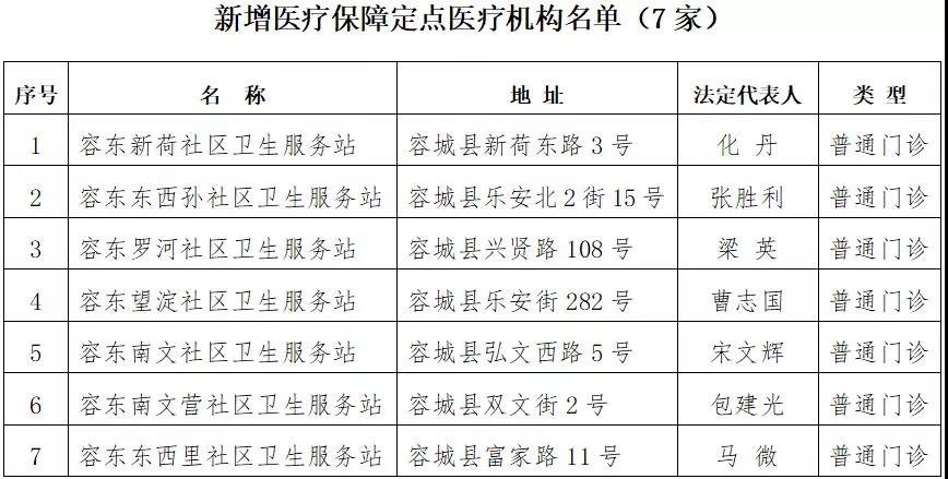 根据《河北省医疗保障定点医疗机构协议管理办法(试行)》(冀医保规〔2019〕1号)《河北省医疗保障定点医药机构纳入实施细则(试行)》(冀医保规〔2020〕4号)等有关规定,遵循公开、公正、公平的原则,经综合考察评估、公示、培训考试及协商谈判等环节,确定容东片区容东新荷社区卫生服务站等7家医疗机构纳入雄安新区医疗保障定点协议管理范围,现予以公告。