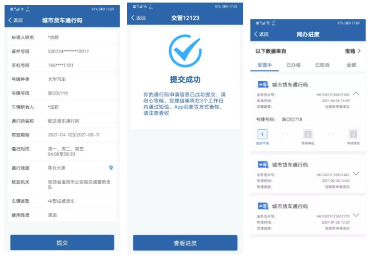 审核通过的,用户点击“交管12123”APP【城市货车通行码申领】进入城市货车通行码首页,点击查看详情,可以查看已核发的货车电子通行码允许车辆通行的时段、路段或区域等具体信息,请驾驶人根据要求驾车通行。在路面遇到民警检查时,可以出示电子通行码供民警扫码核验。
