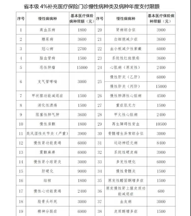 根据政策,省本级4%补充医疗保险参保人员门诊慢性病病种增加到38种。门诊慢性病医疗费起付线200元,多种慢性病年度内不重复计算起付线,超过起付线发生的政策范围内病种医疗费用,个人负担40%,统筹基金负担60%。门诊慢性病实行单病种年度限额支付管理,单一慢性病病种统筹基金年度支出不超过该病种年度支付限额。省本级4%补充医疗保险参保人员门诊慢性病待遇由4%补充保险基金支付,门诊慢性病费用不和住院医疗费用合并计算基本医疗保险基金年度最高支付限额。