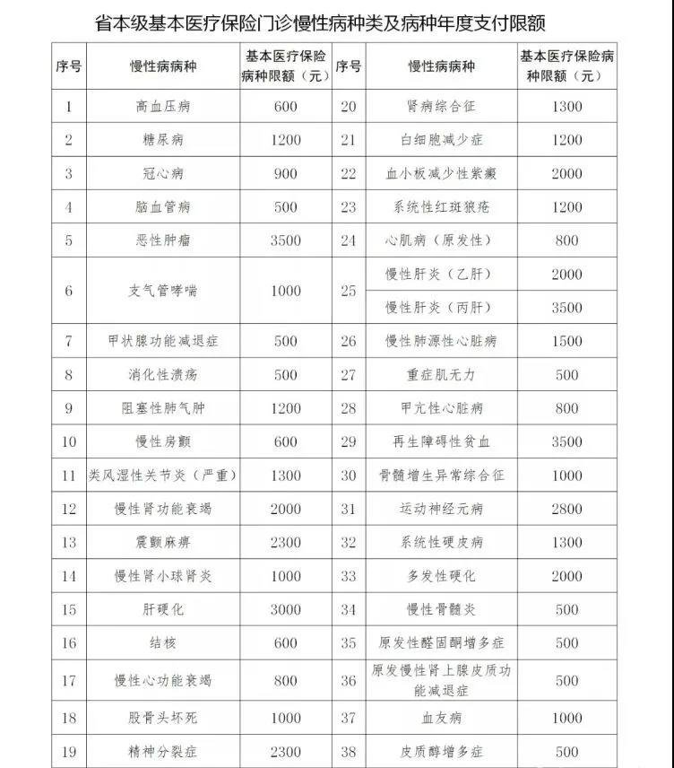 省本级职工基本医疗保险参保人员门诊慢性病病种为38种。门诊慢性病医疗费起付线200元,多种慢性病年度内不重复计算起付线,超过起付线发生的政策范围内病种医疗费用,个人负担50%,统筹基金负担50%。单一病种统筹基金年度支出不超过该病种年度支付限额,患有两种及以上慢性病每人每年统筹基金最高报销限额为5000元。省本级职工基本医疗保险参保人员门诊慢性病待遇由基本医疗保险统筹基金支付,费用单独执行年度最高限额管理,不和住院医疗费用合并计算基本医疗保险基金年度最高支付限额。