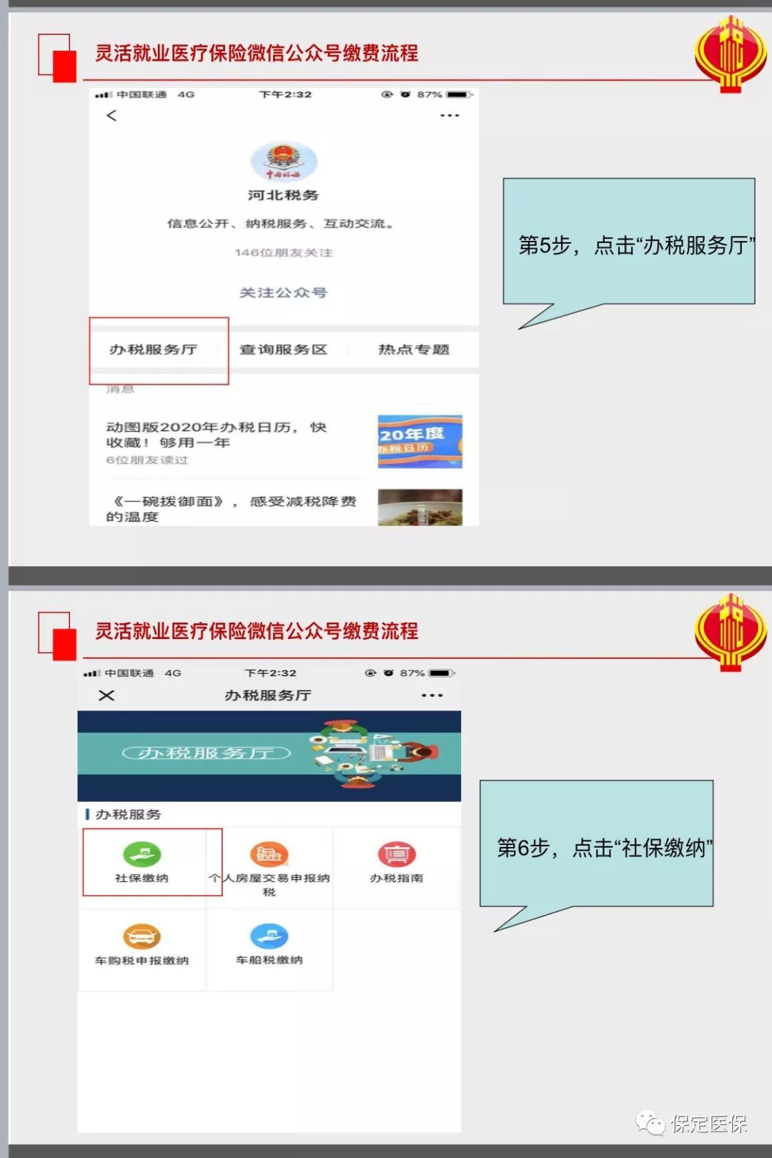 2019年11月份起,保定市灵活就业人员医疗保险费由税务部门统一收,缴费方式发生变化,可通过微信进行自助缴费。具体操作如下: