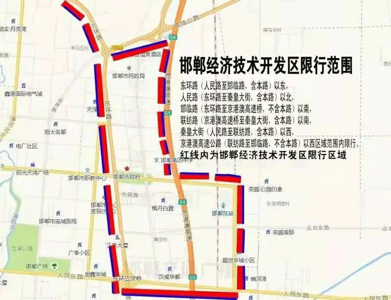 东环路(人民路至邯临路,含本路)以东;人民路(东环路至秦皇大街,含本路)以北;邯临路(东环路至京港澳高速桥,不含本路)以南;联纺路(京港澳高速桥至秦皇大街,含本路)以南,秦皇大街(人民路至联纺路,含本路)以西;京港澳高速公路(联纺路至邯临路,不含本路)以西区域范围内限行;包括外地牌车辆。
