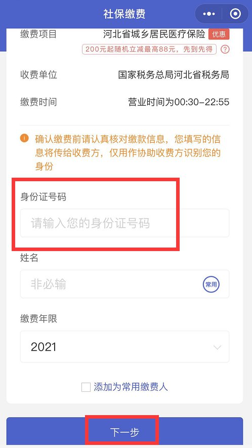 ⑤ 填写个人身份证号码等相关信息,点击【下一步】依据页面提示缴费。