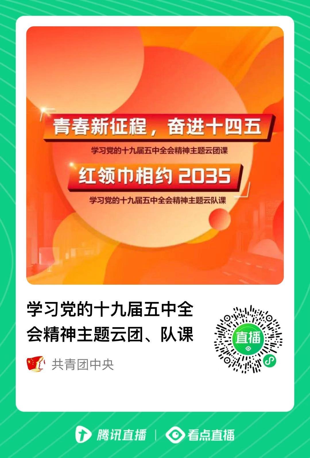 红领巾相约2035直播是为深入学习宣传贯彻党的十九届五中全会精神,开展的“青春新征程奋进十四五”学习党的十九届五中全会精神主题云团课、“红领巾相约2035”学习党的十九届五中全会精神主题云队课