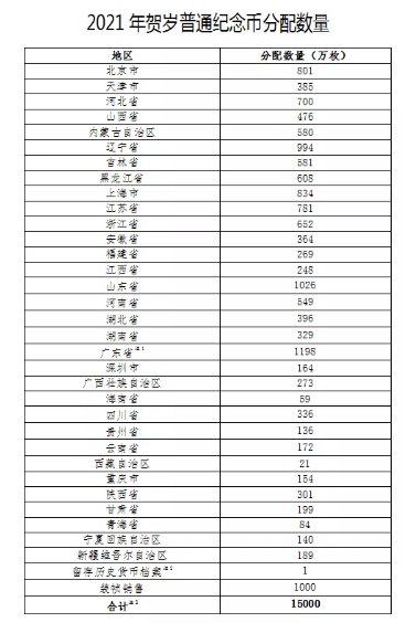 2021年贺岁普通纪念币面额为10元,直径为27毫米,材质为双色铜合金,发行数量为1.5亿枚,其中,预约兑换数量1.4亿枚(含留存历史货币档案1万枚),装帧销售数量0.1亿枚。2021年贺岁普通纪念币在全国各地区分配数量如下: