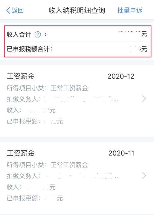 点击进入某一条收入明细还可以查看详细信息。若您发现某笔收入属于身份信息被冒用、本人确实没有取得的情况,您可以点击该笔收入,再点击右上角“申诉”。