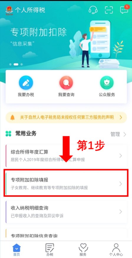 第一步:打开“个人所得税”手机APP,点击“专项附加扣除填报”
