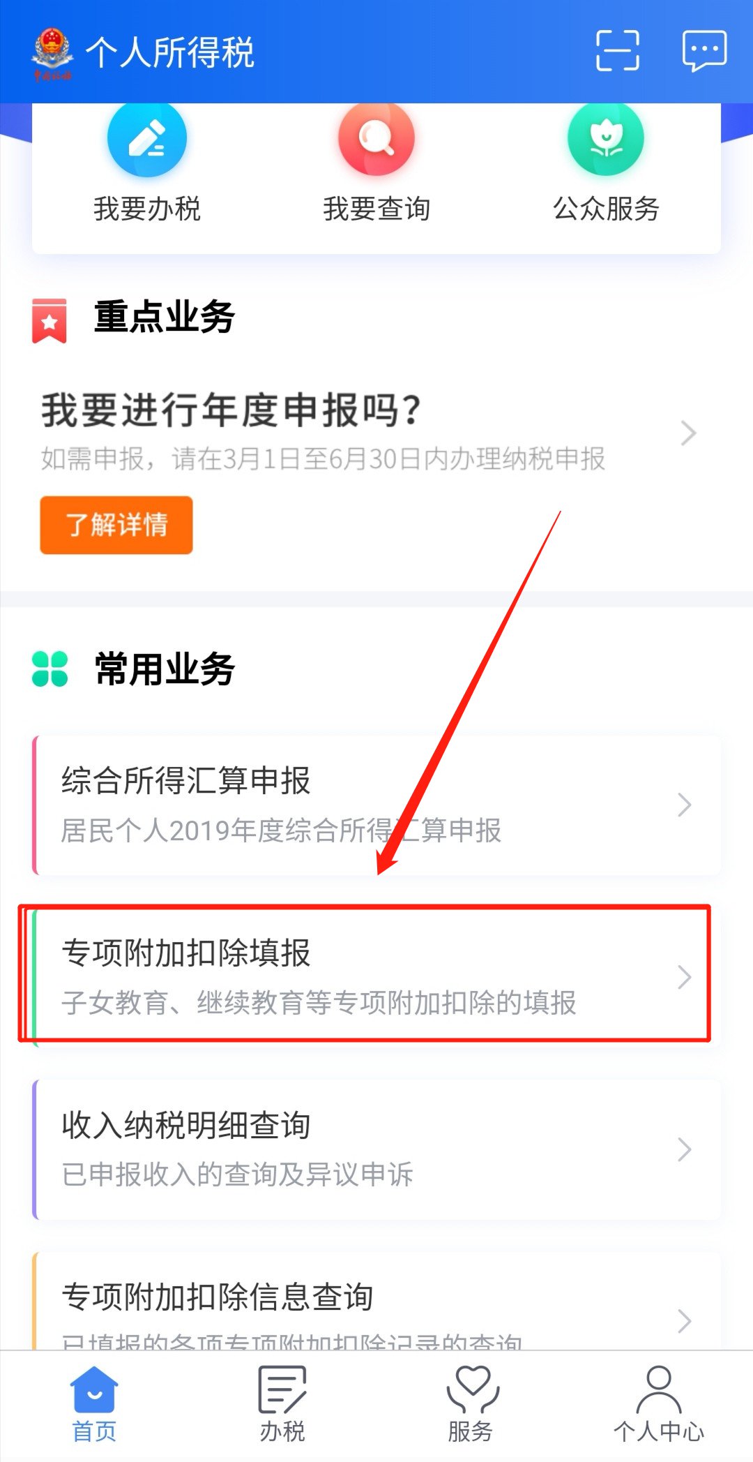 第一步:打开手机“个人所得税”APP,注册并登录后,点击首页中的“专项附加扣除填报”