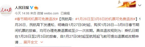 明确自1月27日0时起,购买1月28日—3月8日春节期间机票的旅客,均可办理免费退票或至少一次改期。