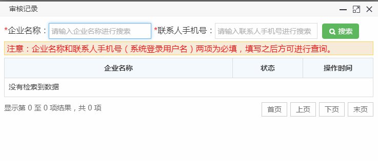 针对未在河北省食品追溯平台入网的企业,在提交注册信息成功后,五个工作日之后,可直接使用相应的用户名和密码进行登录。或在对应的注册页面,通过“查看审核记录”查看审核是否通过,需输入注册时填写的企业名称和联系人手机号进行查询。
