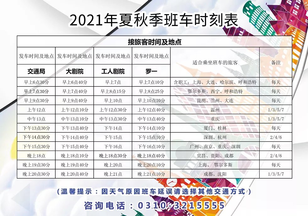 邯郸市交通局→邯郸机场2021夏秋发车时间表: