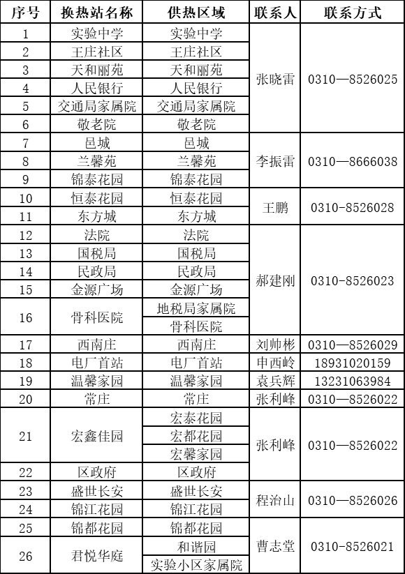 咨询电话:0310-3883969、0310-3823969(非供暖季8:00-17:00,供暖季24小时)。