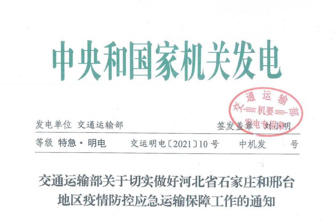 1月7日,交通运输部向全国印发《关于切实做好河北省石家庄和邢台地区疫情防控应急运输保障工作的通知》,部署石家庄和邢台地区的医疗防护物资、生活物资、重点生产物资等应急物资运输保障工作。