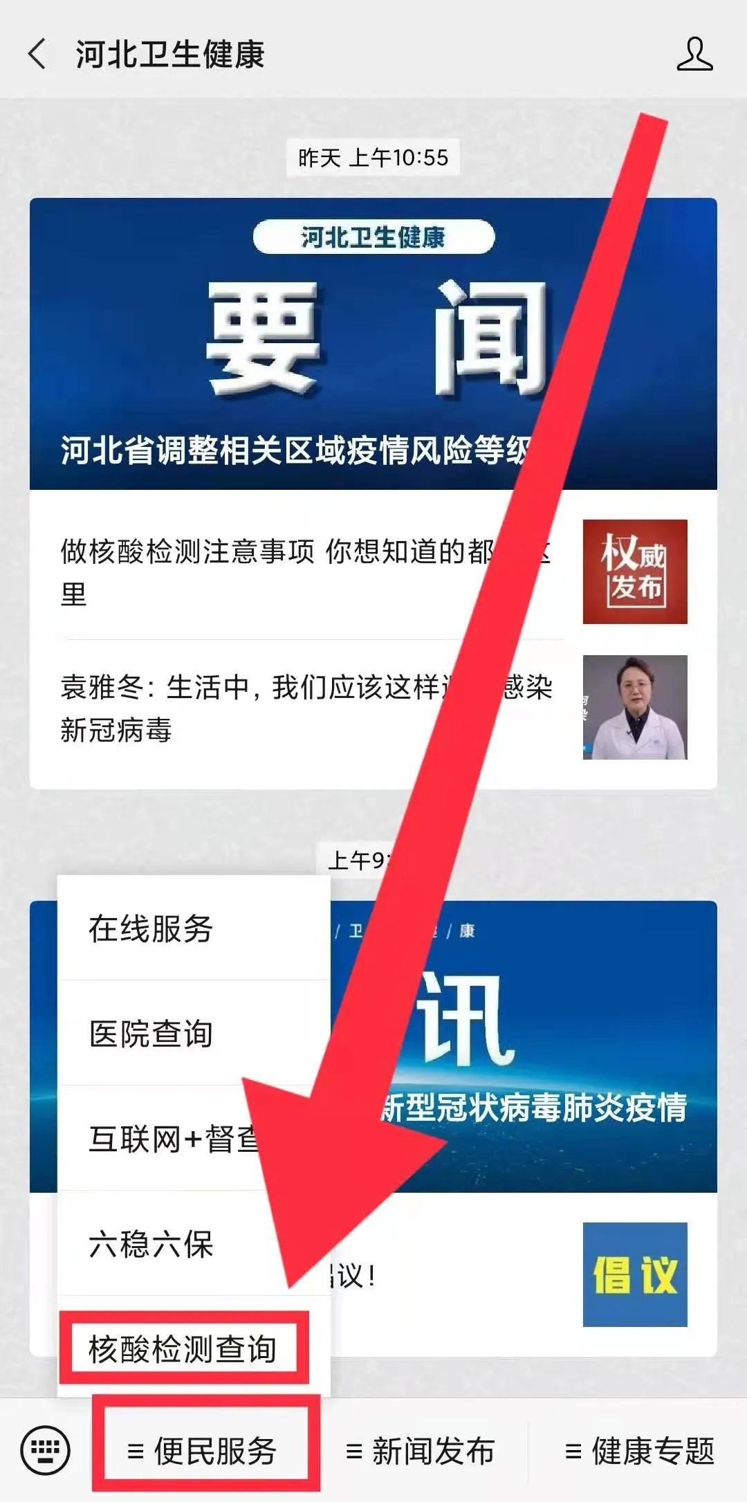 第二步:点击底部菜单【便民服务】→【核酸检测查询】