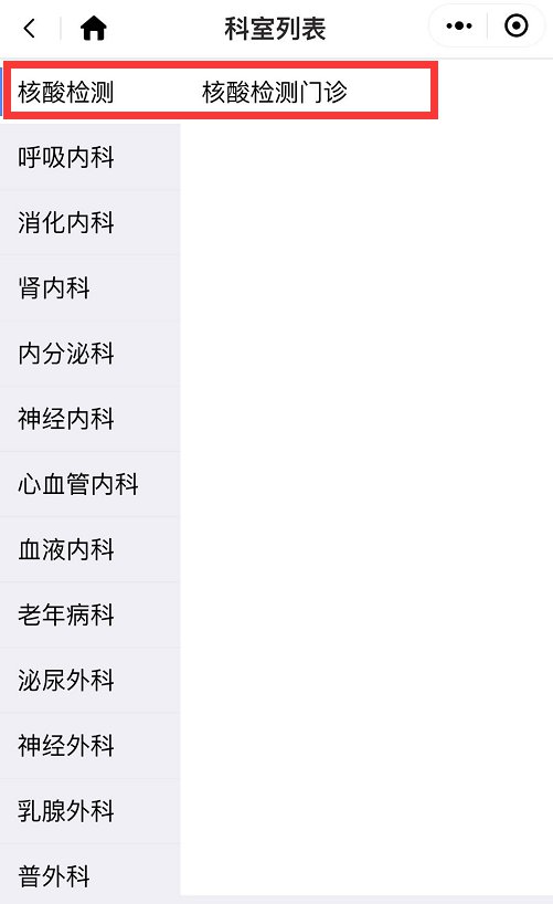 ② 进入科室列表,选择【核酸检测门诊】