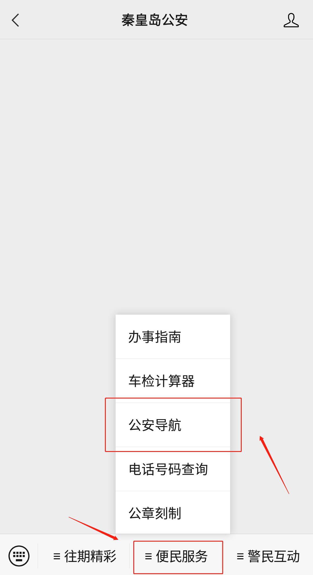 关注【秦皇岛公安】微信公众号,点击下方菜单栏【便民服务】-【公安导航】,打开手机位置信息/允许获取位置信息,即可查看附近的派出所。