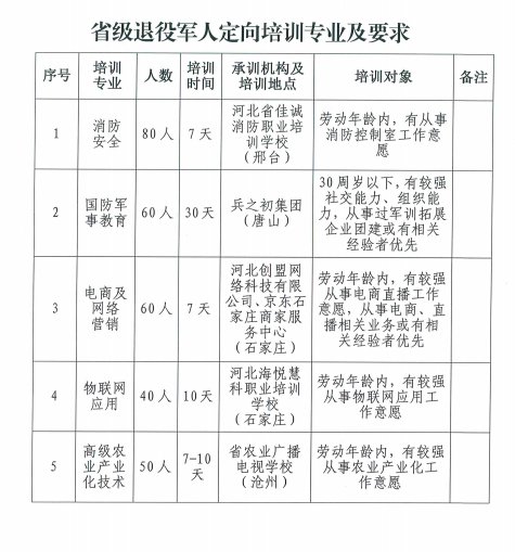按照河北省退役军人事务厅2021年退役军人职业技能培训计划,省级退役军人职业技能培训定为5个专业、总预计290人,分别是:消防安全教育80人;国防军事教育60人;电商及网络营销60人;物联网应用40人;高级农业产业化技术50人(附件)。