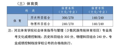 【注】河北体育学院社会体育指导与管理(少数民族传统体育项目)专业高考文化成绩控制线:历史科目组合300分,物理科目组合240分。专业成绩控制线按学校公布的合格线执行。
