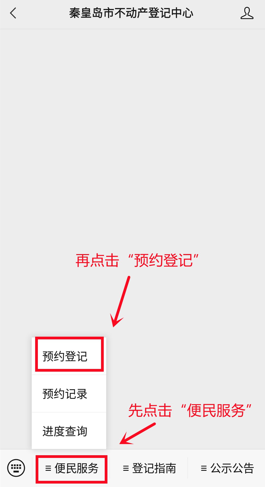 取号→登记,关注“秦皇岛市不动产登记中心”微信公众号,点击“便民服务-预约登记”即可查看相关的预约登记业务,还可以查看预约记录和进度查询。