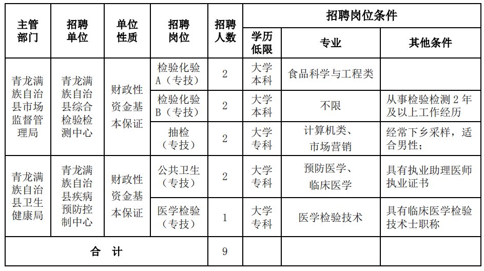 点击链接浏览招聘全文>>青龙满族自治县综合检验检测中心、疾病预防控制中心公开招聘事业人员公告