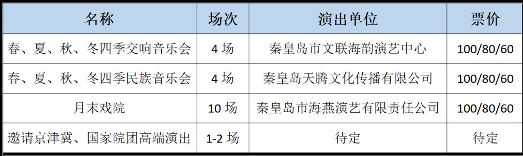 目前,文化惠民卡仅限在市文化广场剧场内使用,观看市小海燕评剧团的月末戏院,每季度各一场的民族音乐会和交响音乐会,同时安排市歌舞团等专业院团的精品演出。以上演出具体时间和节目,将通过“秦皇岛市文旅服务”微信公众号和市文化广场金棕榈国际电影城提前对外公示。