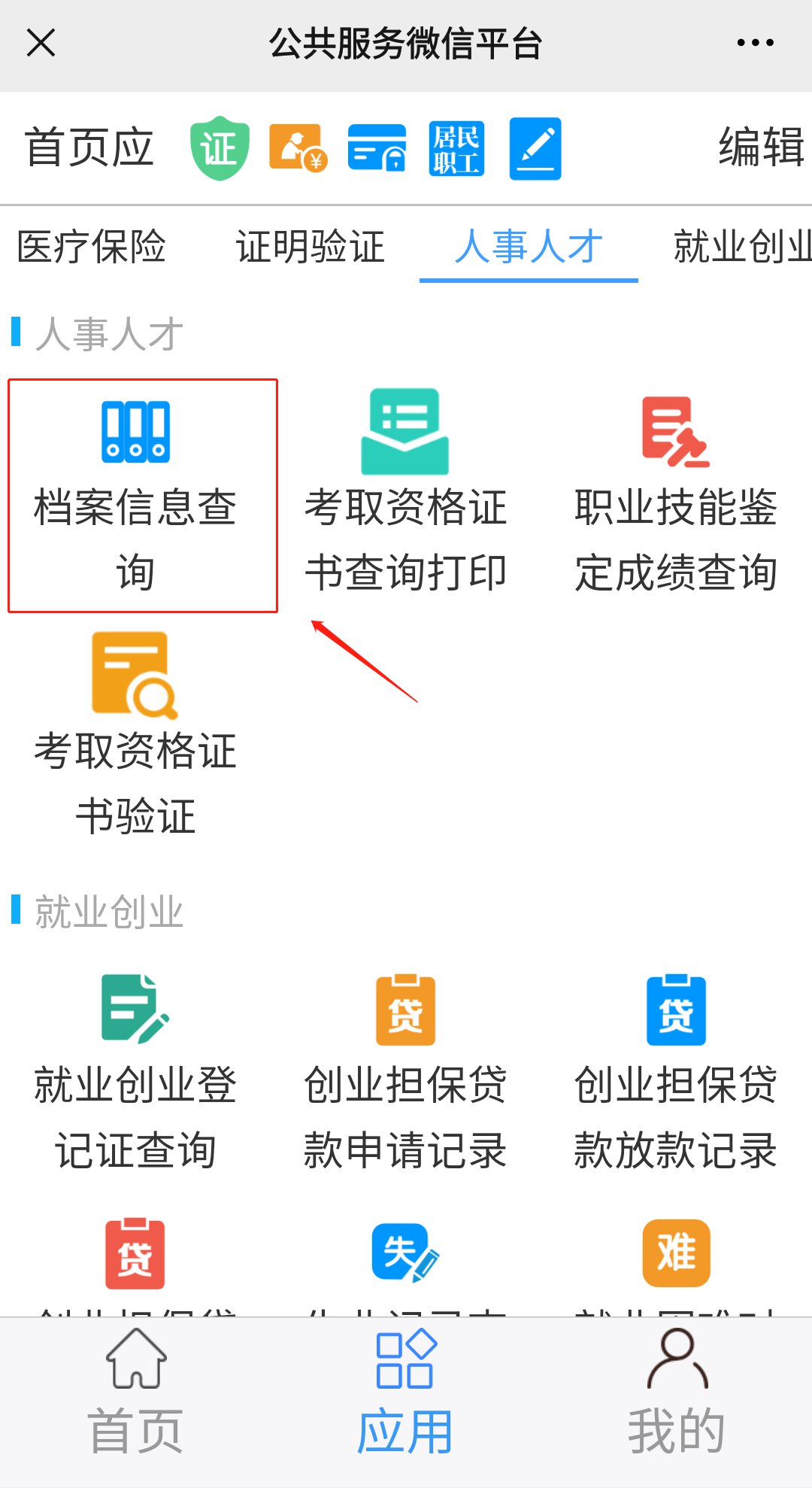 2、点击页面底部的“应用”,进入应用页面后下滑到人事人才一栏,点击“档案信息查询”,输入个人信息即可。