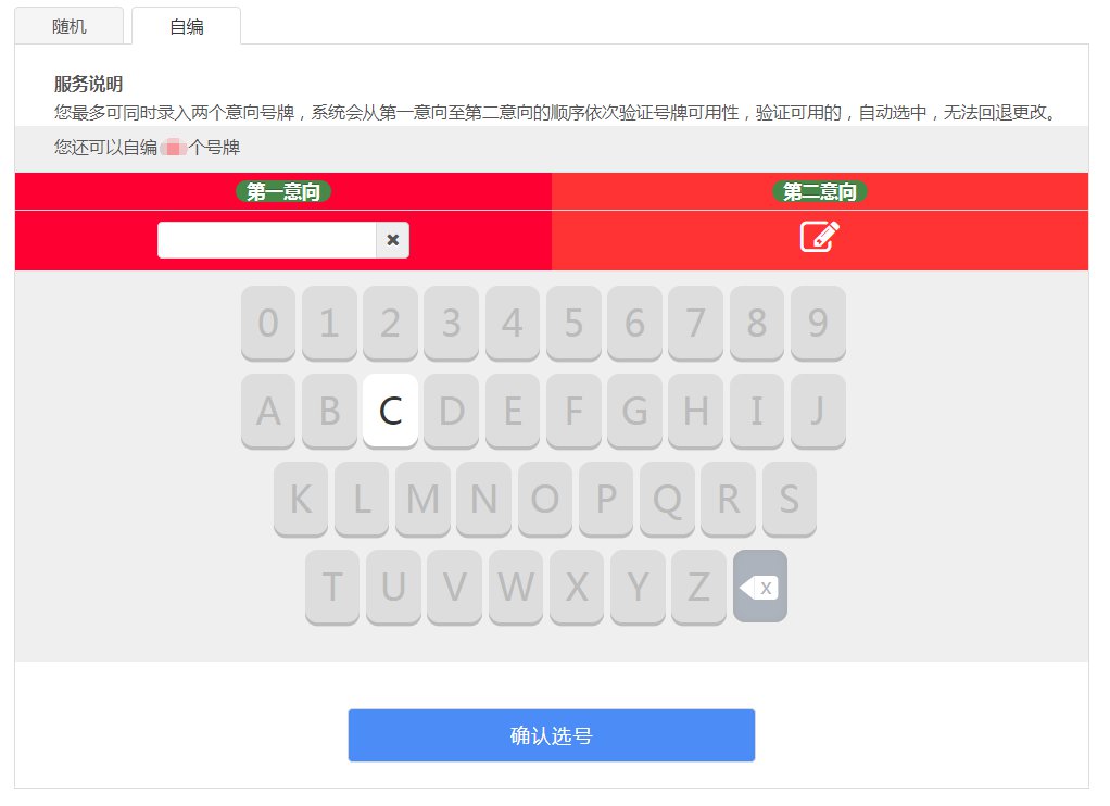 1、身份验证完成后开始选号,分为自编选号和随机选号。自编号牌可以根据虚拟键盘自编心仪的号码,如果号池中存有可通过,如果无法通过则减少一次自编号牌个数。