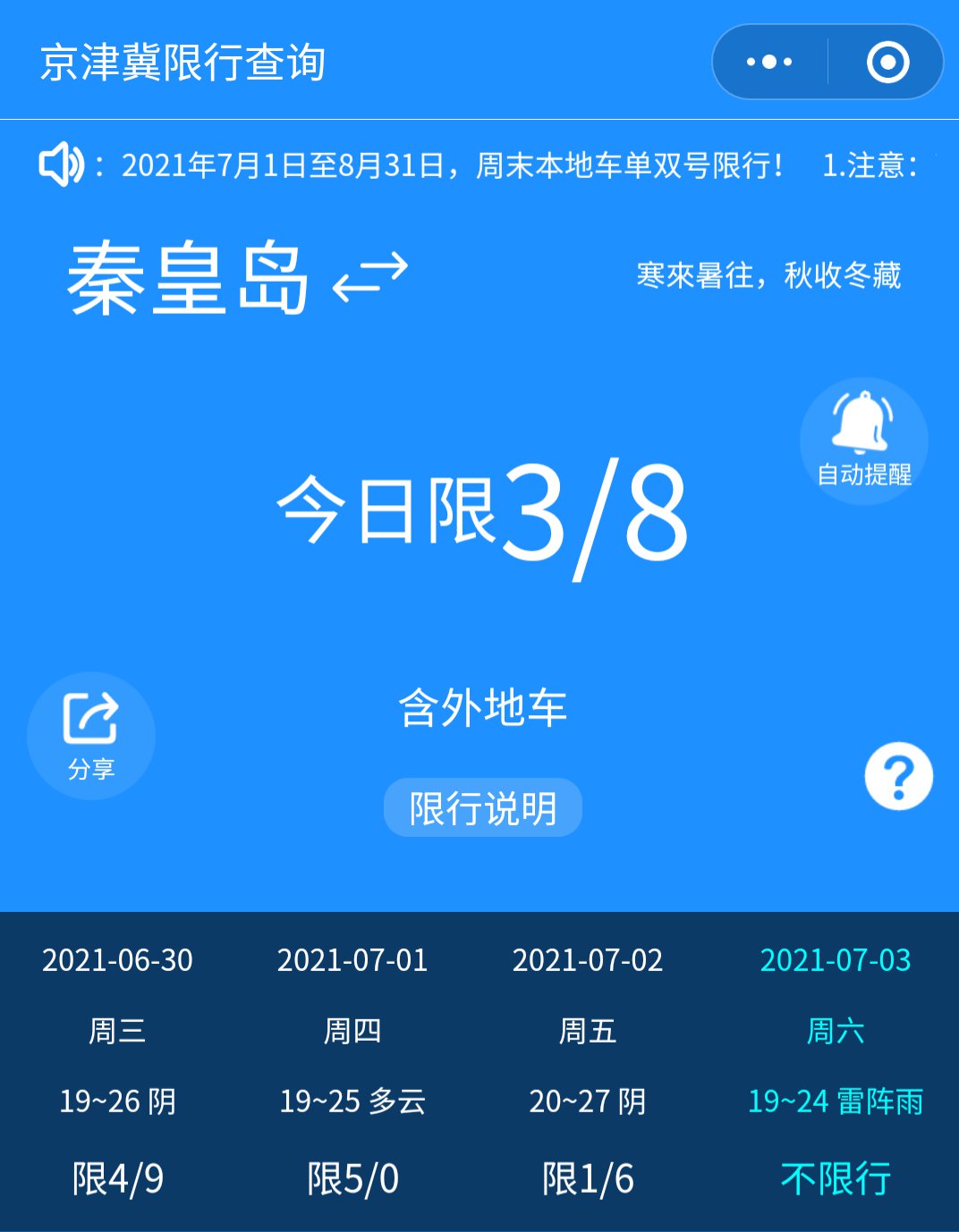 2、进入“京津冀限行查询”小程序,选择对应的城市,会自动显示目前限行的规定。