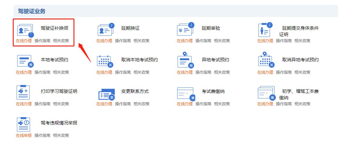 1.登录上述平台,点击【驾驶证业务】→【遗失补证】业务功能办理。