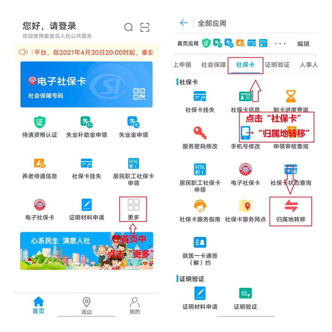 (1)打开“秦皇岛人社”APP首页→“更多”→“社保卡”→“归属地转移”