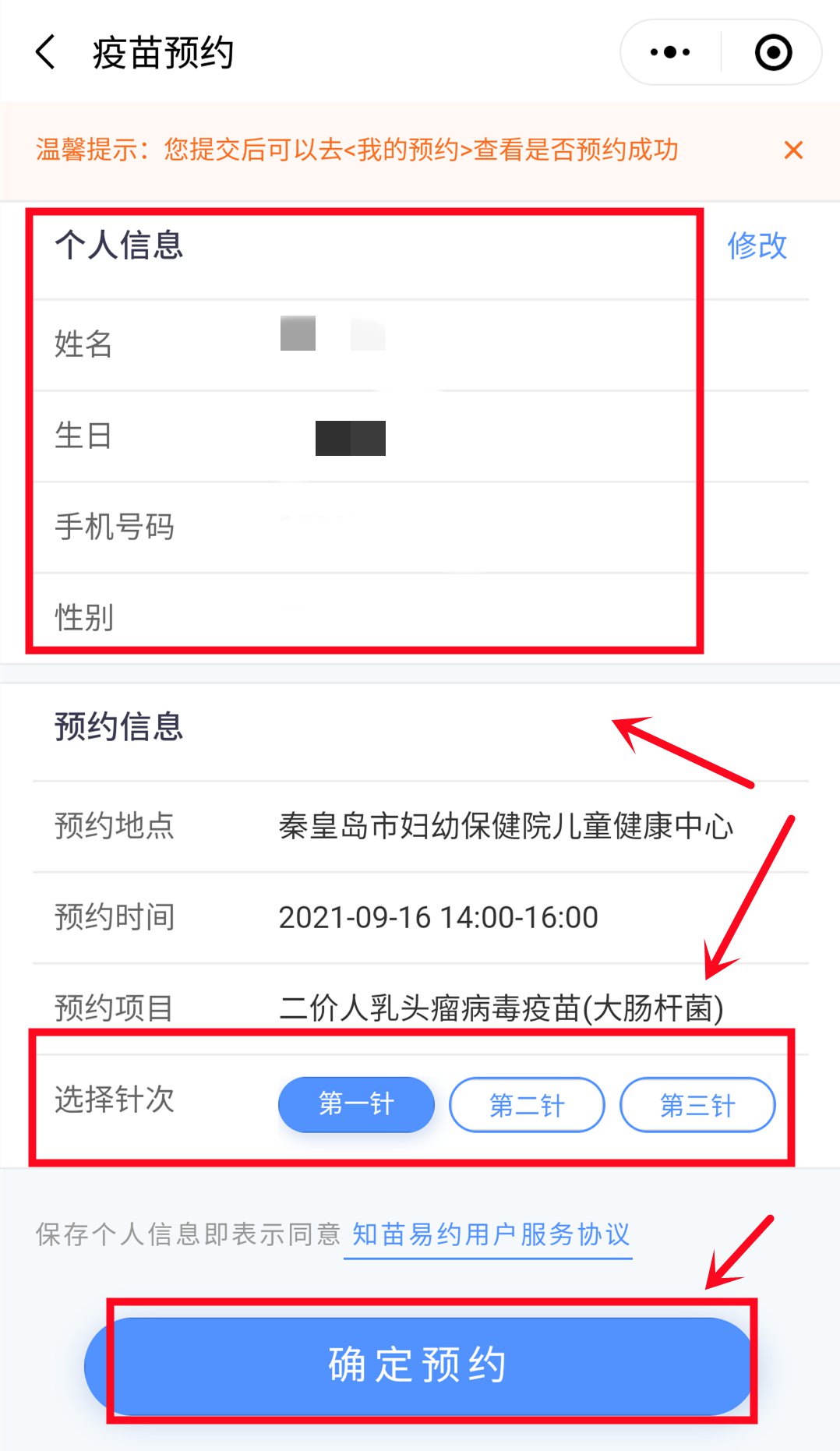 5、确认个人信息无误,选择接种针次,确定预约时间和地点后确定预约即可