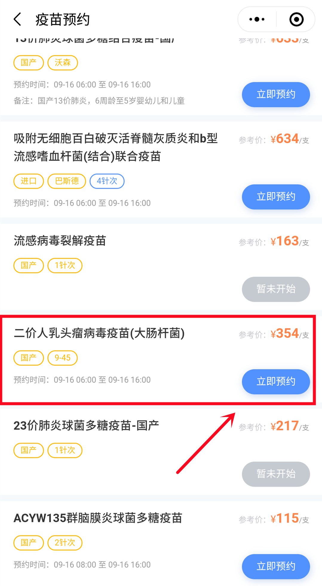 3、下滑页面找到想要预约的疫苗,后面有参考价格,点击“立即预约”