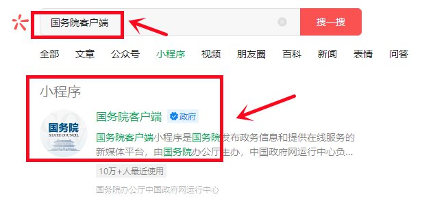 1、微信搜索“国务院客户端”小程序